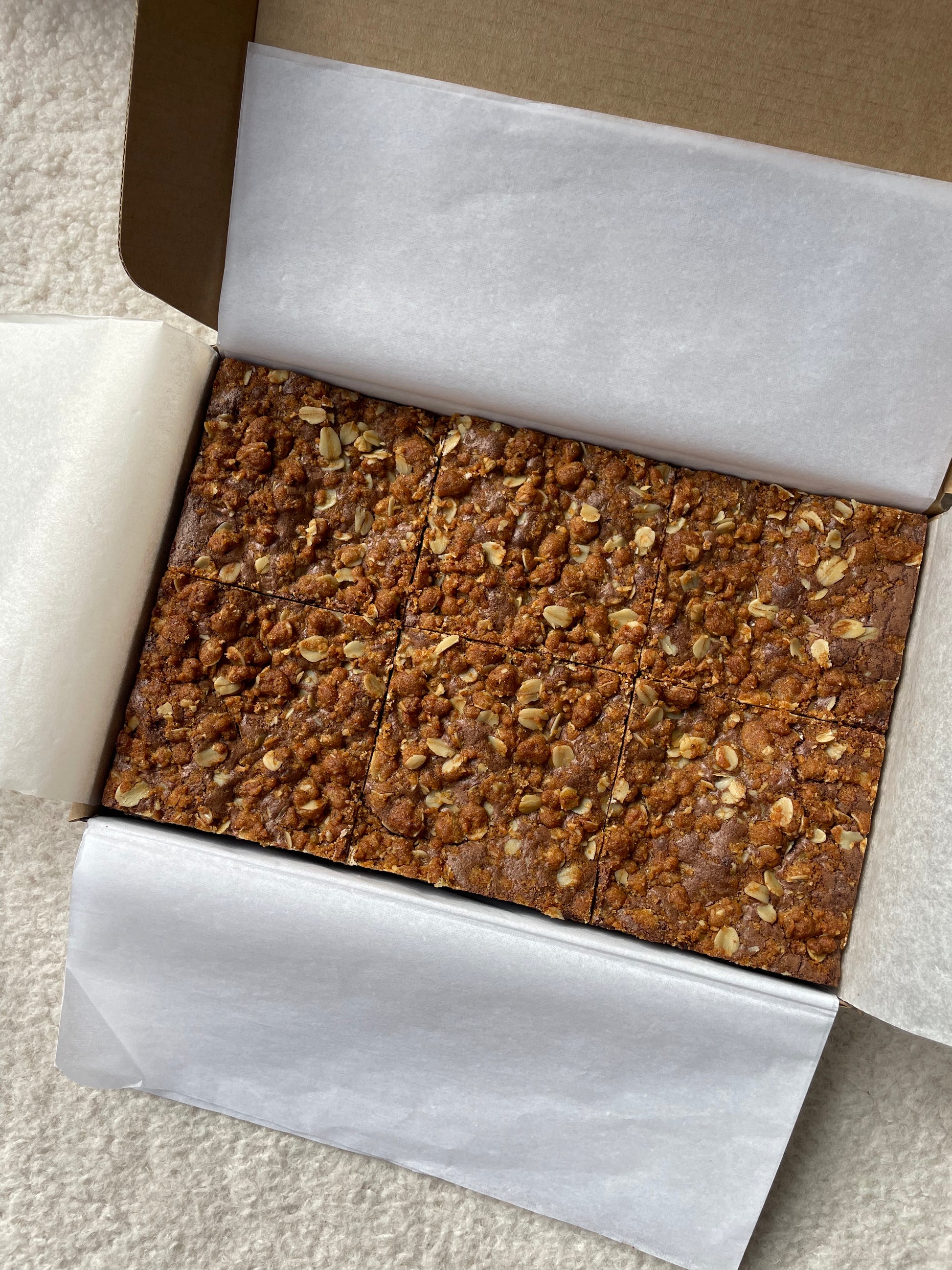 Your brownies are packaged carefully to ensure they arrive undamaged. We use greaseproof paper, tissue paper and bubble wrap before being placed snug in a cardboard box and finally into a padded mailer bag.