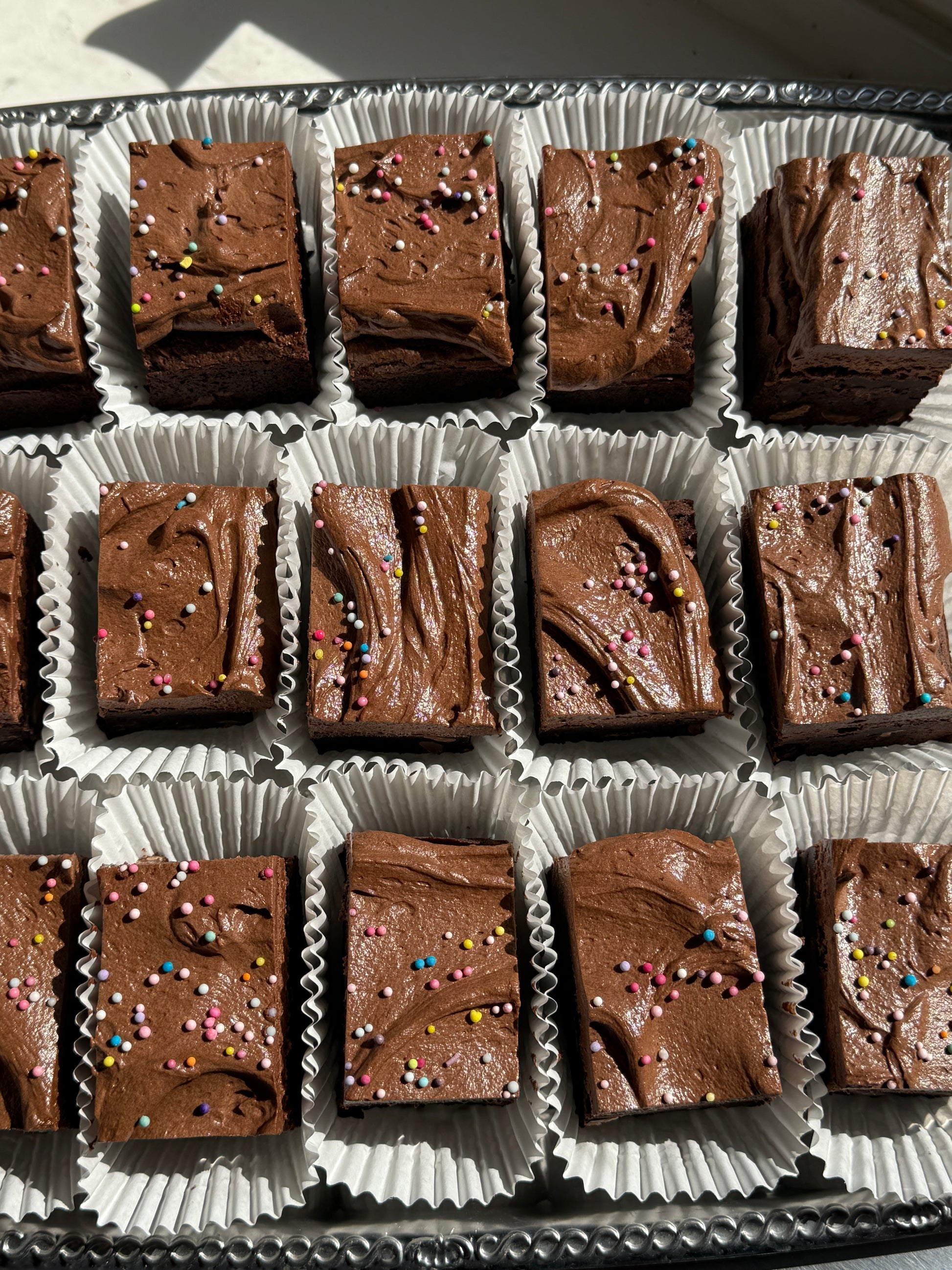 Our Sprinkle Fudge Brownies are the definition of indulgence! Baked with premium Callebaut milk and dark chocolate for a rich, fudgy bite every time. Each brownie is finished with a swirl of whipped chocolate frosting and a playful sprinkle topping.