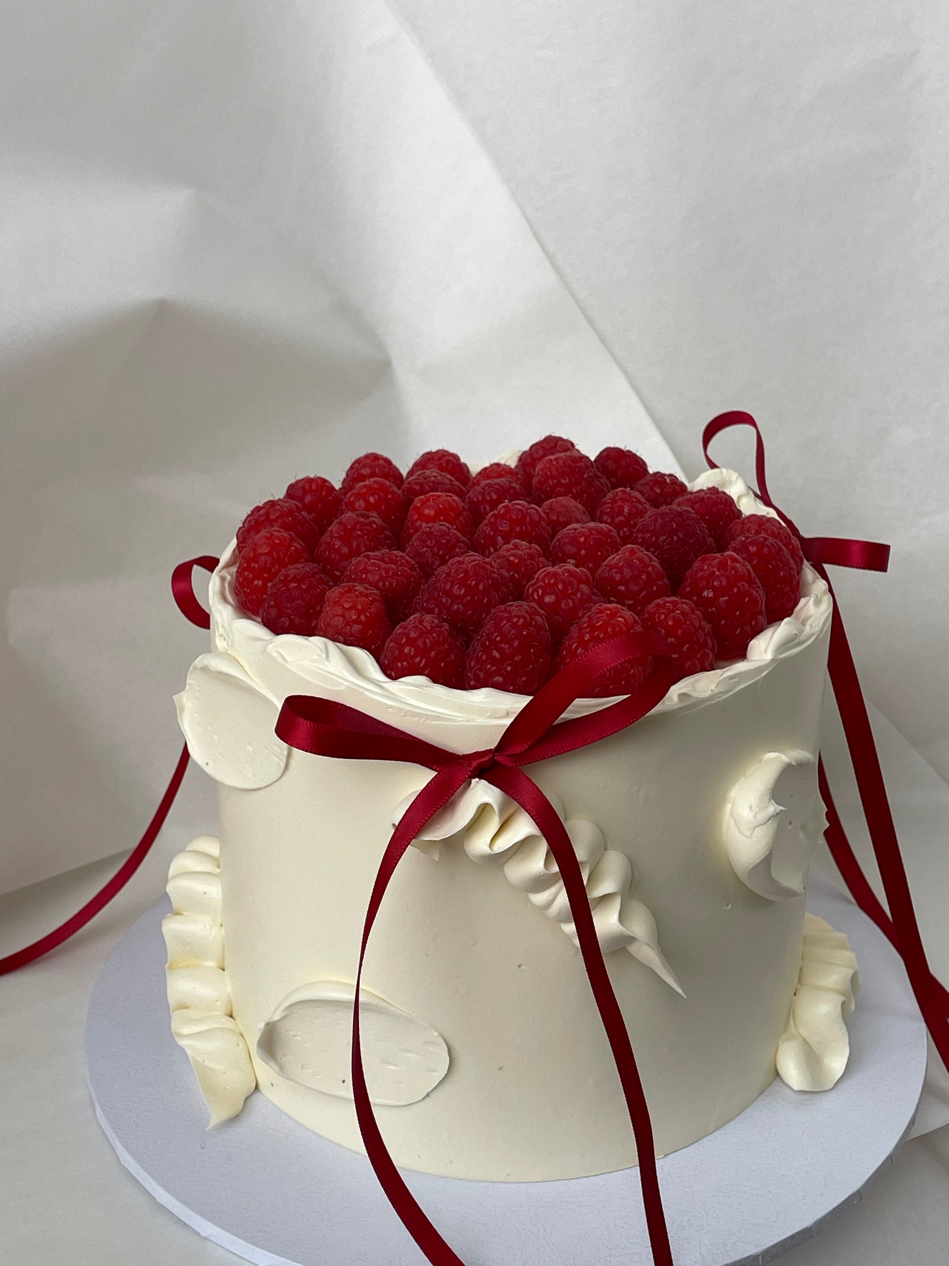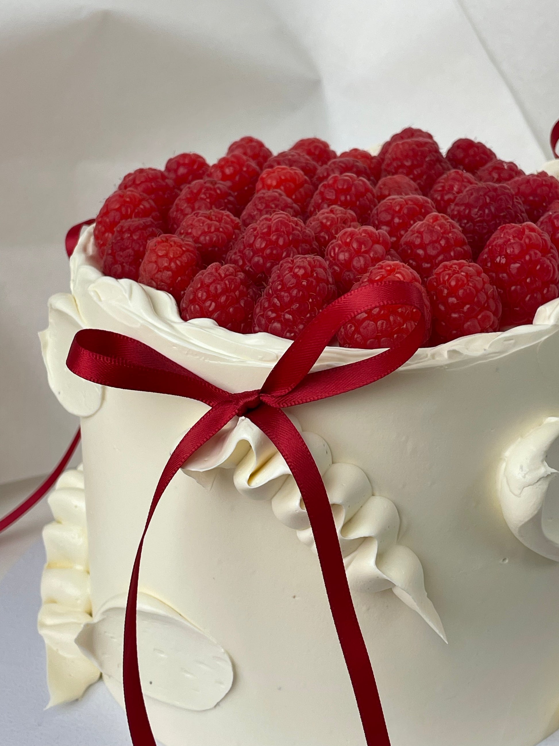 This cake is adorned with red bows, piping details and topped with fresh raspberries!
